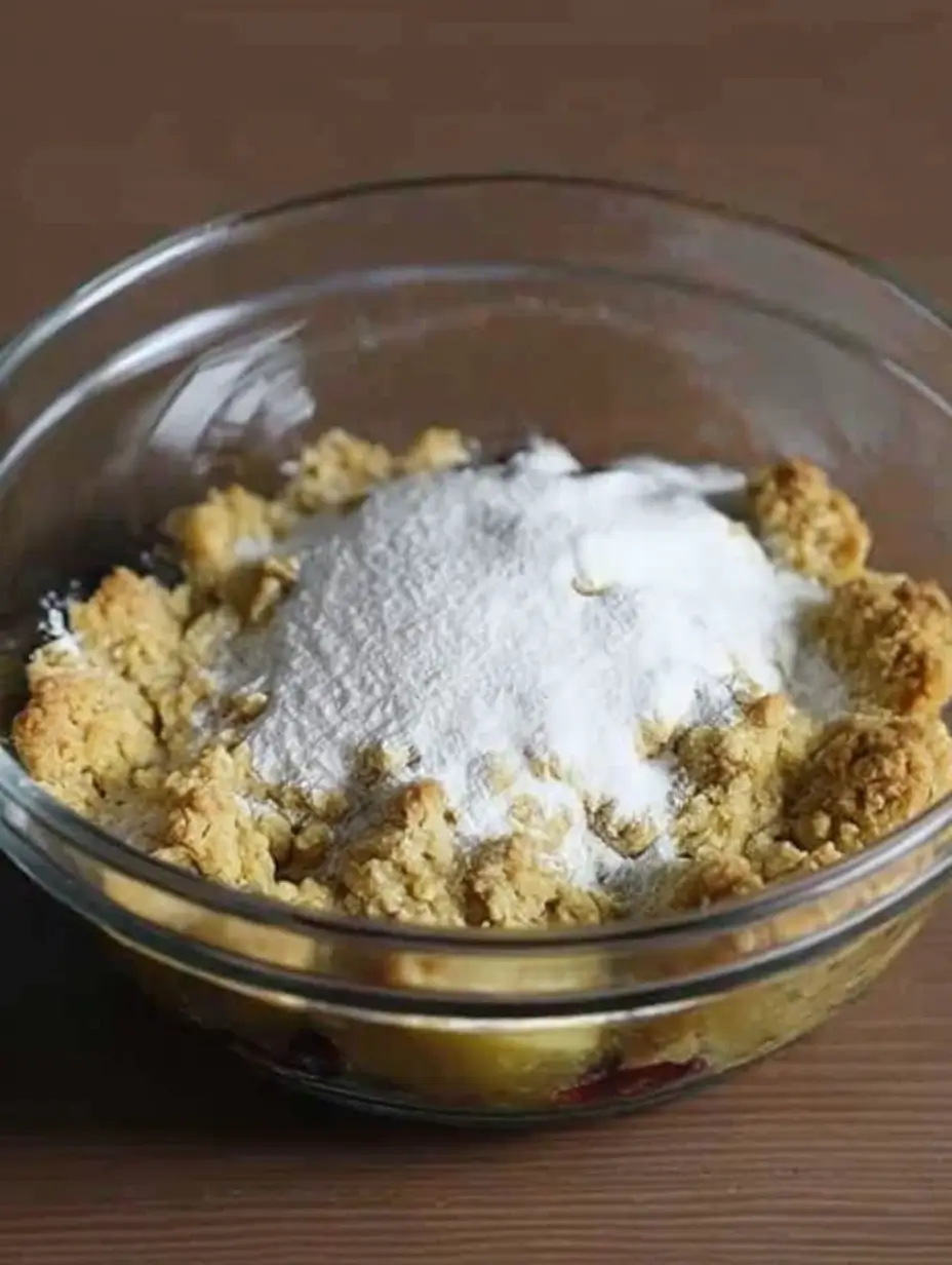 - Sprinkle the crumble topping evenly over the fruit.