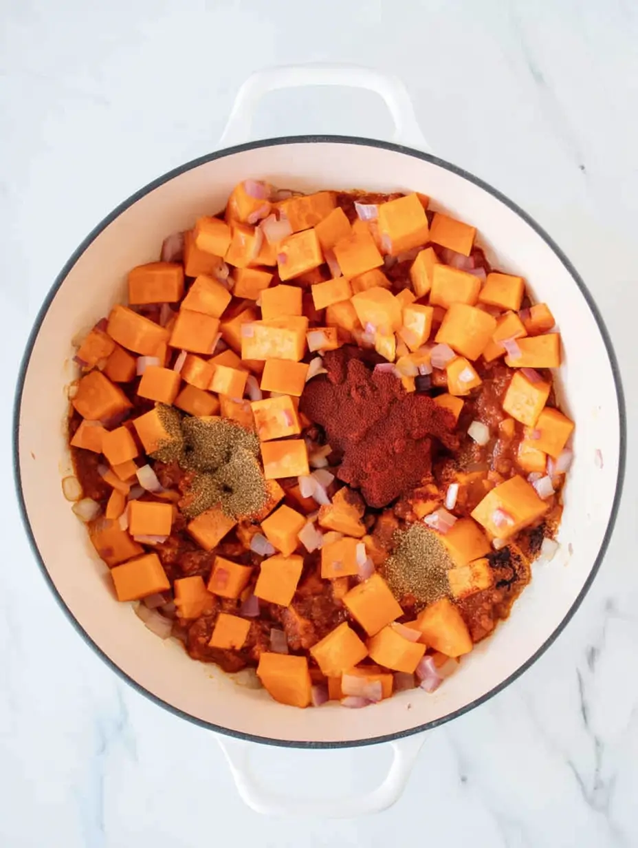 - Stir in sweet potato, chili powder, cumin, paprika, salt, and pepper. Cook for 2 minutes.