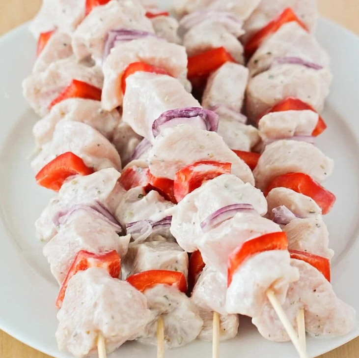 Start with 1.5 lbs boneless chicken breasts cut into chunks, ½ cup Greek yogurt, ¼ cup lemon juice, oregano, garlic powder, salt, and pepper. These create the tangy base that tenderizes meat beautifully. For veggies, grab red bell peppers and onions.