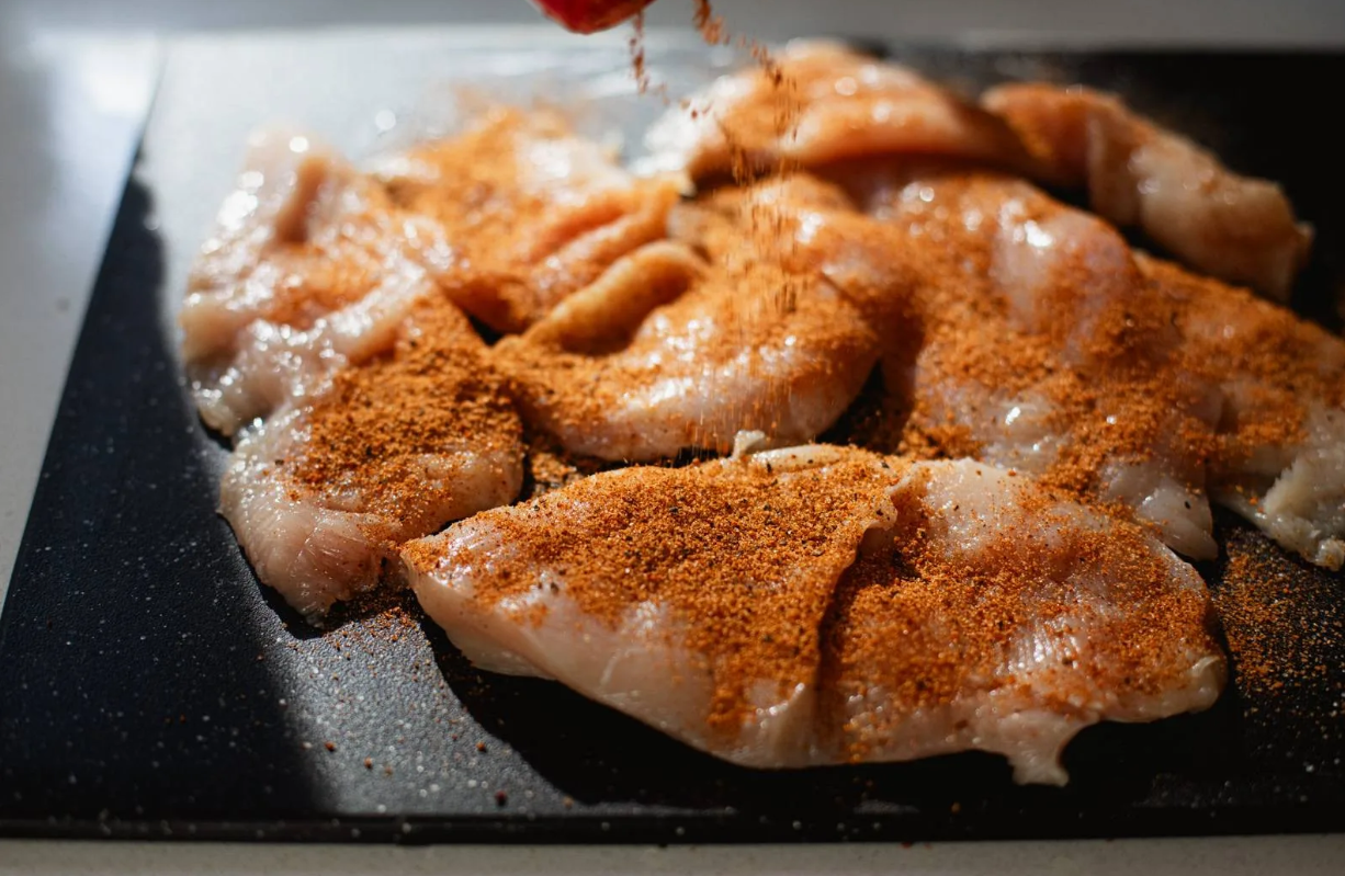 Slice or pound 1 lb boneless skinless chicken breasts into thin pieces (about 1/4-inch thick) – this ensures quick, even cooking and maximum tenderness. Right on the cutting board, season generously with 2-3 Tbsp all-purpose chicken seasoning (like McCormick Rotisserie for paprika, garlic, onion, and salt vibes). The spices create a flavorful crust that browns beautifully; if your mix has sugar, expect extra caramelization.