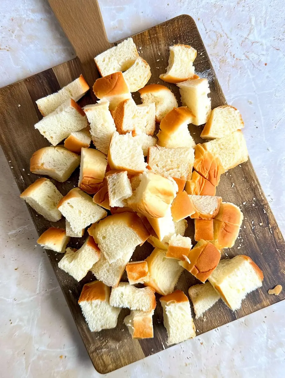 First, grab those cinnamon rolls (or bread) and cut them into generous 1-inch cubes. Don’t be too precise – uneven pieces create wonderful texture contrasts. Arrange them in your greased baking dish, letting some pieces stick up at angles. This isn’t a fussy recipe – just toss them in there!