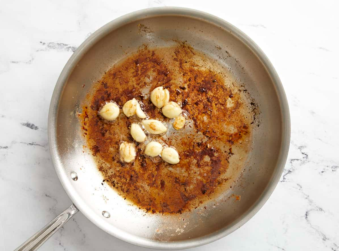- Lower heat to med-low. Add 1 Tbsp butter + smashed garlic. Sauté 3 min until fragrant & lightly golden, stirring often.