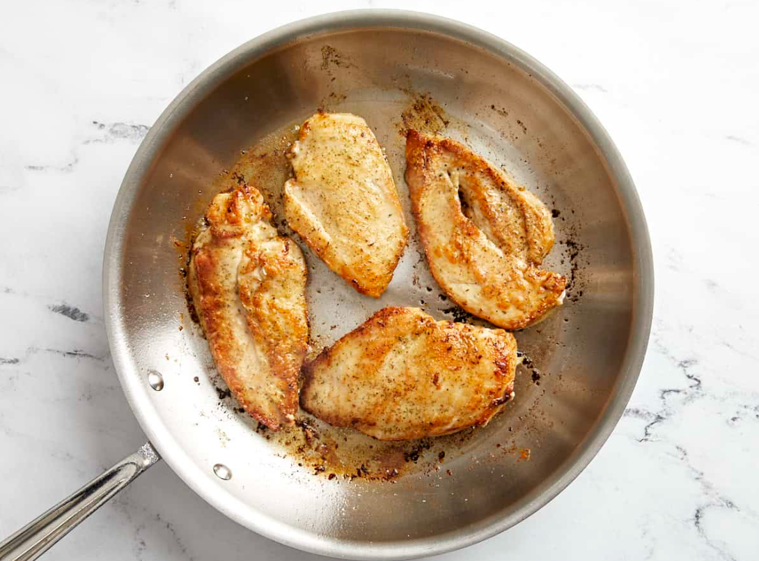 Heat a large skillet over medium heat and add 2 Tbsp olive oil and 1 Tbsp of butter. The combination of oil and butter gives you the high smoke point of oil for browning plus the rich flavor of butter. Once the skillet is hot and the butter is foaming slightly (but not browning), add the chicken. Cook on each side until golden brown and cooked through, about 4 minutes per side. You’re looking for an internal temperature of 165°F if you have a thermometer, but visual cues like firm texture and clear juices work too.
