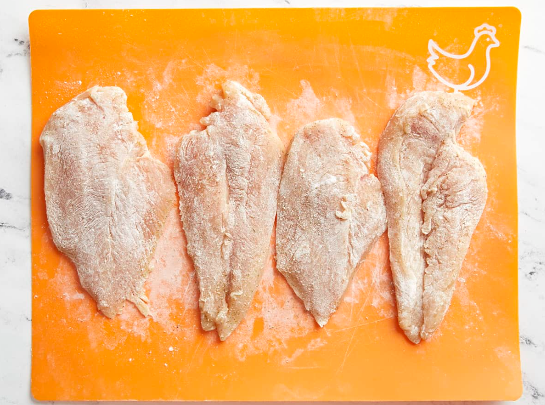 - Season chicken cutlets with Italian seasoning, salt, pepper. Dredge in flour, shaking off excess.