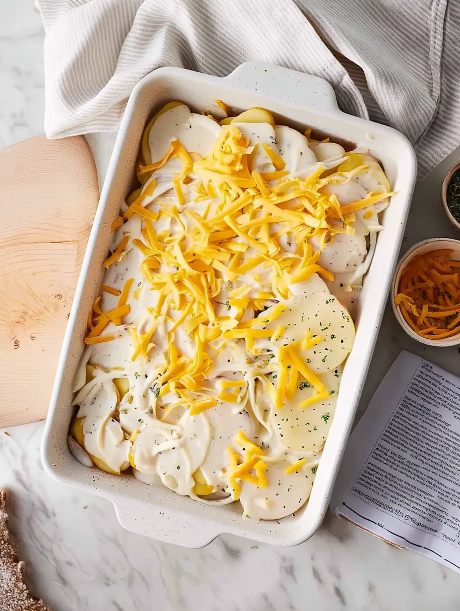 - Layer half the potato slices in a greased baking dish. Pour half the sauce over them.