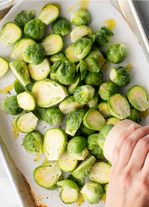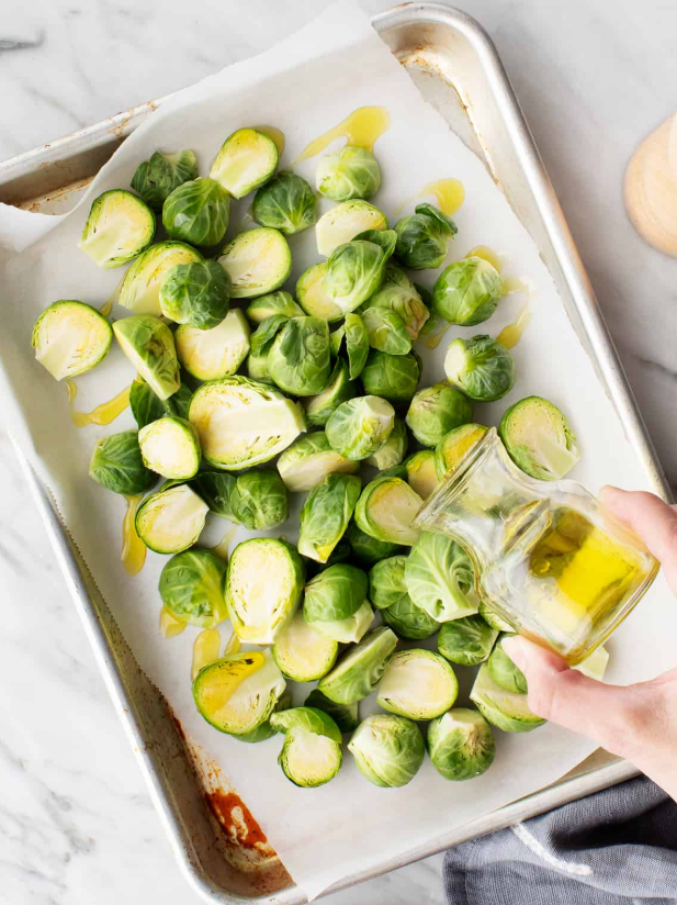 - Toss the Brussels sprouts with olive oil, salt, pepper, and garlic powder.