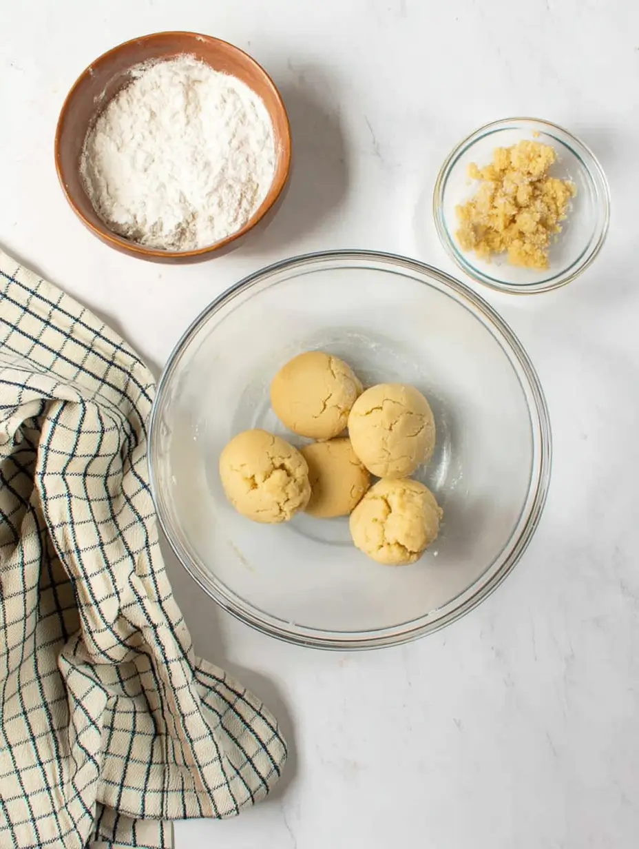 - Roll dough into small balls, flatten slightly, and place on baking sheet.